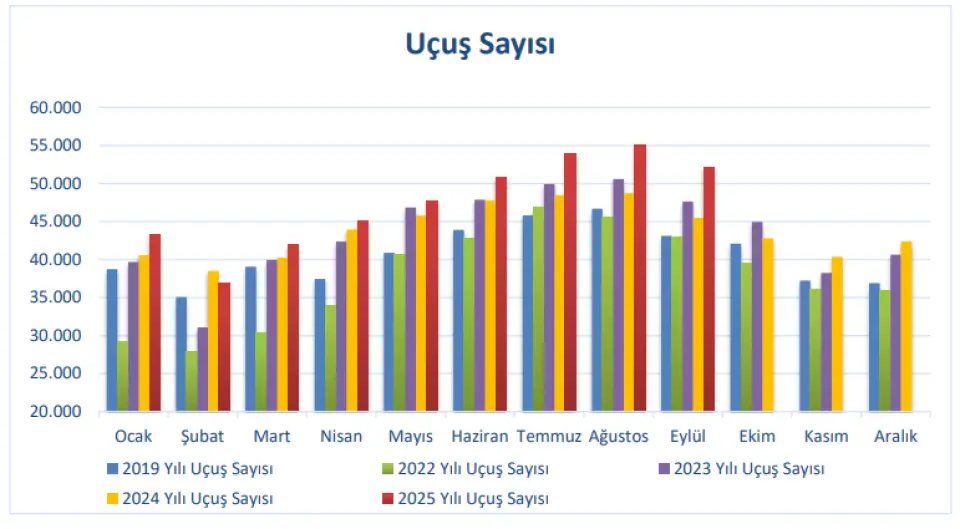 Türk Hava Yolları (THYAO) tarafından 2025 yılının eylül ayında gerçekleştirilen uçuş sayısı bir önceki yılın aynı dönemine göre %14,6 artarak 52.131 seviyesine yükselmiştir. Yıllık bazda yurt içi uçuş sayısı %20,8 artarken, yurt dışı uçuş sayısı ise %11 artış göstermiştir. Pandemi öncesi dönem olan 2019 yılına göre karşılaştırdığımızda ise uçuş sayısı %20,9 artış göstermiştir.