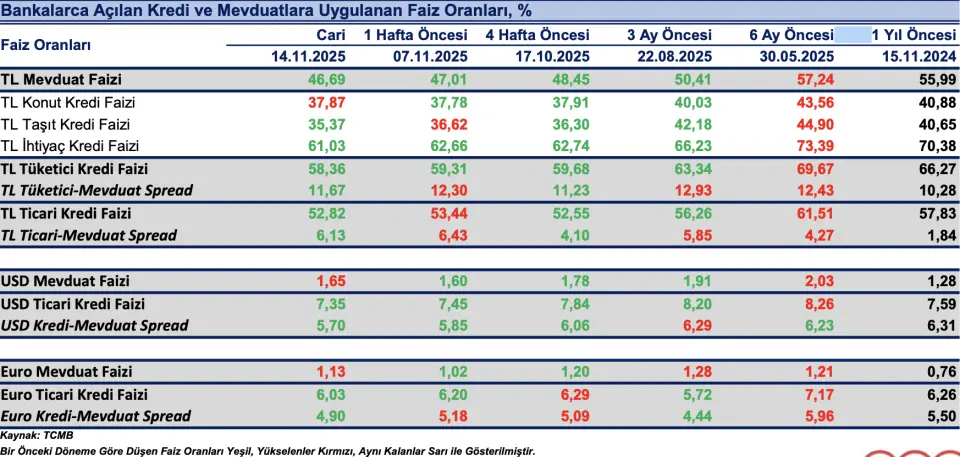 Bankaların TL mevduat için uyguladıkları faiz oranı 14 Kasım haftasında bir önceki haftaya göre 32 baz puan azalışla %46,69 olurken, dolar mevduat faizi 5 baz puan artışla %1,65 ve Euro mevduat faizi 11 baz puan artışla%1,13 oldu.