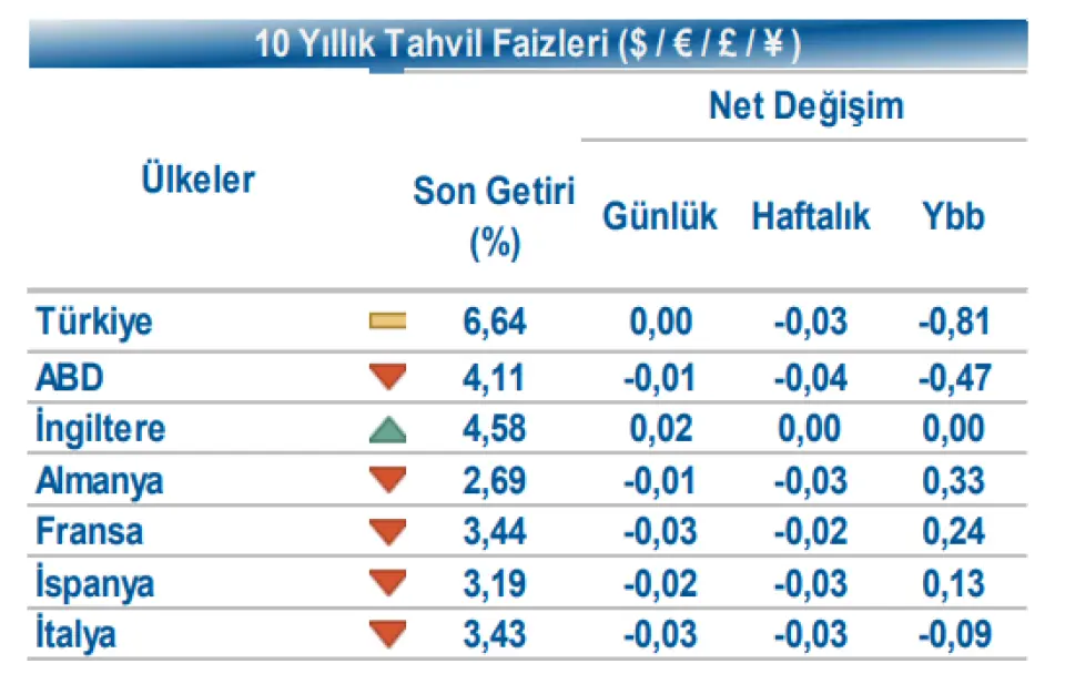 Dolar Endeksi 99,734 seviyesine yükselirken, Euro / Dolar paritesi 1,1574 seviyesine geriledi. Dolar / TL spot kuru ise 42,36 seviyesinden işlem gördü. Yurt içi tarafta, TL tahvil piyasalarında alıcılı seyir izlendi. 2 yıllık gösterge tahvilin bileşik faizi 31 bp azalışla %39,54, 10 yıllık gösterge tahvilin faizi 28 bp azalışla %32,40 seviyesinden işlem gördü.