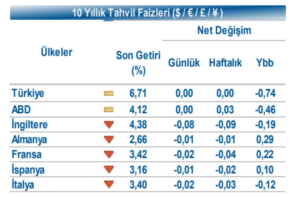 Halk Yatırım yayınladığı tarihli 12 Kasım günlük bültende tahvil ve döviz piyasalarındaki gelişmelere yer verdi. Aracı kurumun analizi şu şekilde:Küresel piyasalarda, ABD’de Gaziler günü nedeniyle tahvil piyasalarının kapalı olduğu günde, ABD 10 yıllık gösterge tahvil faizi değişim göstermeyerek %4,12, Almanya 10 yıllık gösterge tahvil faizi 1 bp artışla %2,66 seviyesinden işlem gördü. Türkiye’nin 5 yıllık Dolar cinsi CDS risk primi 1 bp azalışla 243 bp seviyesinde işlem görürken, Ocak 2035 vadeli 10 yıllık Eurobond faizi yatay seyirle %6,71 seviyesinden kapanış gerçekleştirdi.