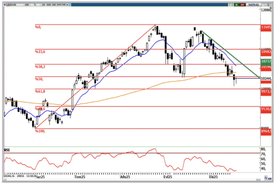 - "Tüm bu gelişmelerin sonucunu zayıf bir görünüm ile bekleyen Borsa İstanbul 100 endeksi kritik olarak gördüğümüz 10.285 seviyesinin aşağısında fiyatlanıyor. Yukarı fiyatlamanın oluşması adına teknik olarak bu seviyenin aşıldığını görmek gerek. 10.285 üzerinde fiyatlamalar oluşmaya başlarsa 10.500/ 700 bölgesine doğru tepki olarak adlandırabileceğimiz artışlar öngöreceğiz. Yalnız şunu vurgulayalım; Mevcut görüntüde 10.700’e doğru yaşanacak her yükselişi tepki olarak nitelendireceğiz."
