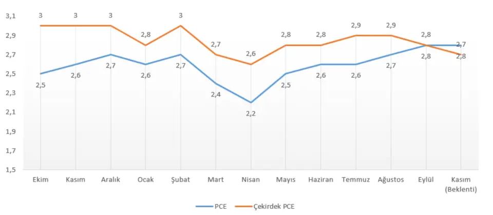 Eylül ayına ilişkin PCE enflasyonu aylık 0,3% artış gösterirken, yıllık rakam 2,7%’en 2,8%’e yükselmişti. Çekirdek PCE enflasyonu aynı dönemde 0,2% artarken, yıllık rakam 2,9%’dan 2,8%’e gerilemişti.