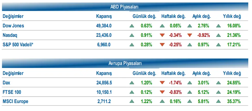 Dow Jones %0,63 artışla 49.384,01, S&P 500 endeksi %0,55 artışla 6.913,35 ve Nasdaq %0,91 artışla 23.436,02 seviyesinden günü tamamladı. Tahvil faizleri cephesinde 2 yıllık tahvil faizi %3,61, 10 yıllık tahvil faizi %4,25 seviyesine hafif yükseldi. VIX endeksi ise 16,90’dan 15,64 seviyesine geriledi. Avrupa piyasalarında da pozitif seyir izlendi. DAX endeksi %1,20, Euro Stoxx 50 endeksi %1,22, FTSE 100 endeksi %0,12 ve CAC 40 endeksi %0,99 değer kazandı. Euro Bölgesi’nde tüketici güven endeksi açıklandı. Beklentinin -13,0 olduğu tüketici güveni Ocak’ta -12,4 seviyesinde gerçekleşti. Önceki ayın verisi -13,1’den -13,2’ye revize edildi.
