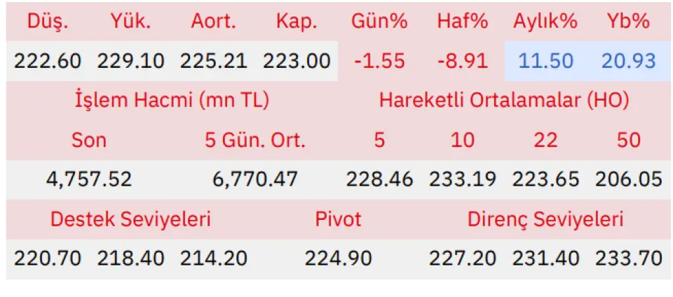 Gün içinde en düşük 222.60 en yüksek 229.10 seviyesini gören Türkiye Petrol Rafinerileri hissesinin günü %1.55 kayıpla tamamladığı gözlenmektedir. Pivot seviye 224.90 seviyesinden geçmekte olup, aşağı yönlü hareketlerde birinci destek 220.70, ikinci destek ise 218.40 seviyesinden geçmektedir. Dirençler ise sırasıyla 227.20, 231.40 seviyelerinden geçmektedir. Bu aşamada endeksin 5 günlük HO seviyesinin %2.39 altında, 22 günlük HO seviyesinin ise %0.29 altında hareket ettiği dikkat çekmektedir. Son gün işlem hacmi ise bu aşamada 5 günlük ortalama işlem hacminin % 29.73 altında gerçekleşmiştir.