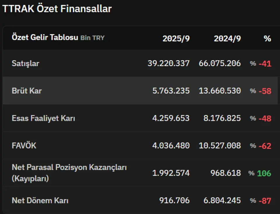 TTRAK geçen yılın 3. çeyreğinde 6.804.245.000 TL kar açıklamıştı. Şirket bu yıl 3. çeyrekte ne yazık ki karını %87 oranında düşürerek sadece 916.706.000 TL kar rakamı açıkladı.