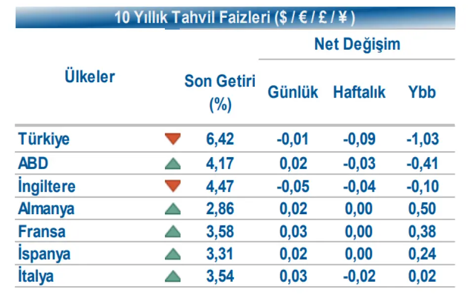 Veriler sonrası tahvil piyasaları satıcılı seyir izledi. Gün içinde, ABD 10 yıllık gösterge tahvil faizi %4,17, Almanya 10 yıllık gösterge tahvil faizi 2 bp artışla %2,86 seviyesinden işlem gördü. Türkiye’nin 5 yıllık Dolar cinsi CDS risk primi 3 bp azalışla 211 bp seviyesinde izlenirken, Ocak 2035 vadeli 10 yıllık Eurobond faizi %6,41 seviyesinden işlem gördü.