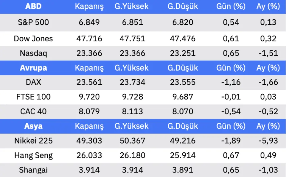Emtia tarafında Brent petrol OPEC+'ın 1. çeyrekte üretim artışlarını durdurma kararını yinelemesinin ardından 63 doların üzerinde işlem görürken, Kazakistan'dan gelen akışları etkileyen boru hattı hasarı fiyatları yukarı destekledi. Gümüş ve bakır geçen haftaki rekorların ardından yükselişini sürdürdü. Genel olarak Aralık ayı, zayıflayan risk iştahı, Fed belirsizliği, BOJ'un normalleşme sinyalleri ve kripto satışlarının gölgesinde başlarken, analistler Fed'in zaten yüksek oranda fiyatlanan indirim ihtimali nedeniyle ek "güvercin" katalizörler için alanın daraldığını vurguluyor.