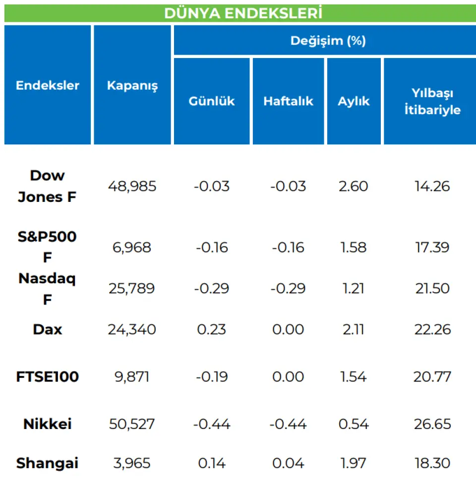 Avrupa Piyasaları: Avrupa piyasaları haftaya temkinli bir iyimserlikle başlarken, vadeli işlemler endekslerin pozitif açılışa hazırlandığına işaret ediyor. Euro Stoxx 50 vadeli kontratları yaklaşık %0,3 oranında yükselerek bölge genelinde hisse senetlerine yönelik risk iştahının sürdüğünü gösteriyor. Küresel ölçekte yapay zekâ odaklı ralli ve Fed’in faiz indirim döngüsüne ilişkin beklentiler Avrupa borsalarına da destek sağlarken, yatırımcılar aynı zamanda jeopolitik gelişmeler ile emtia fiyatlarındaki oynaklığı da yakından izliyor. Özellikle gümüş ve diğer değerli metallerdeki sert hareketler ile enerji fiyatlarındaki dalgalanmanın, Avrupa sanayi şirketleri ve enflasyon görünümü üzerindeki etkileri açısından takip edildiği görülüyor. Avrupa piyasalarında yıl sonu rallisinin devam edip etmeyeceği, küresel büyüme dinamikleri ve merkez bankalarının 2026 politika patikasına dair gelecek yeni sinyallere bağlı olacak.