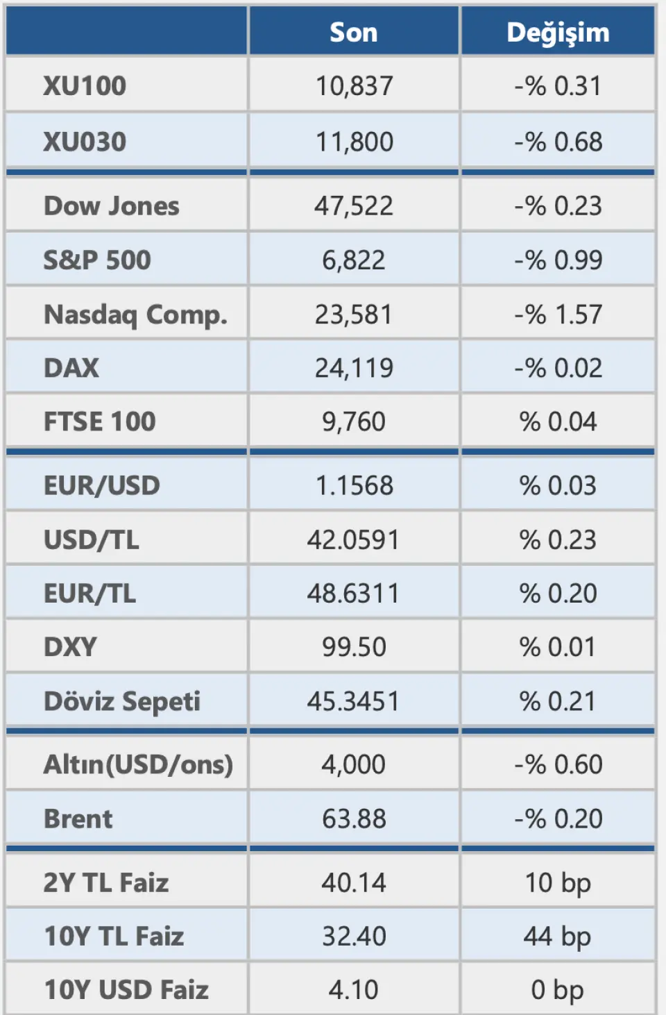 - "Ayın son işlem gününde yurt içinde ajanda yoğunluğunun yüksek olduğunu görüyoruz. Bu kapsamda Merkez Bankası 23 Ekim 2025'te yaptığı ve politika faizini 100 baz puan indirimle %39,50’ye çektiği Para Politikası Kurulu toplantısının özetlerini yayımlayacak. Özetlerde yeni bir mesaj verilme ihtimali düşük görünse de Merkez Bankası’nı daha küçük ölçekli faiz indirimi yapmaya iten nedenlere ilişkin daha fazla detay görebiliriz."