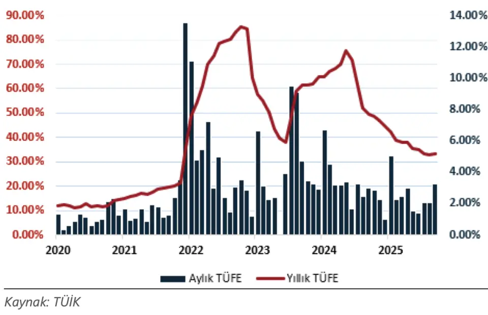 - "TÜİK Ekim ayı enflasyon rakamlarını saat 10.00’da duyuracak. Anımsanacağı gibi Eylül'de TÜFE %3,23 oranında artarak %2,6 olan piyasa beklentisini belirgin şekilde geride bırakmıştı. Böylece yıllık enflasyon bir önceki aya oranla 0,34 puan artarak %33,29 seviyesine yükselirken 15 aydır arka arkaya süren dezenflasyon süreci kesintiye uğramıştı. Bu tabloya paralel olarak Merkez Bankası 300 ve 250 baz puanlık faiz indirimlerinin ardından Ekim'de indirimlerin boyutunu azaltma ihtiyacı hissetmiş ve politika faizinde 100 baz puanlık indirim yapmıştı. Merkez Bankası'nın 2025 sonu enflasyon ara hedefi %24 seviyesinde bulunurken tahmin aralığı ise %24-29 bandında yer alıyor. Ancak Eylül'de enflasyonun ana eğilimindeki yükseliş yıl sonunda söz konusu bandın üzerinde bir rakamla karşılaşma ihtimalimizin çok yüksek olduğuna işaret ediyor."