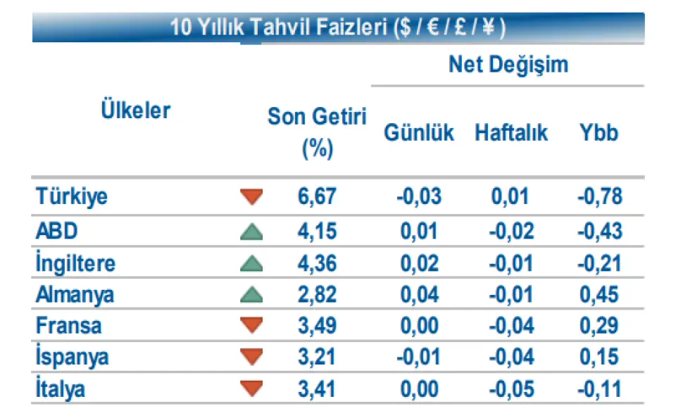 Veriler sonrası tahvil piyasalarında alıcılı seyir izlendi. Gün içinde ABD 10 yıllık gösterge tahvil faizi 1 bp artışla %4,15, Almanya 10 yıllık gösterge tahvil faizi 4 bp artışla %2,82 seviyesinden işlem gördü. Türkiye’nin 5 yıllık Dolar cinsi CDS risk primi 6 bp azalışla 217 bp seviyesine gerilerken, Eylül 2035 vadeli 10 yıllık Eurobond faizi 3 bp azalışla %6,67 seviyesinden işlem gördü. Döviz tarafında, majör para birimlerinin çoğunluğu ABD Dolar’ı karşısında değer kaybetti. Dolar Endeksi 99,444 seviyesine yükselirken, Euro / Dolar paritesi 1,1607 seviyesine geriledi.