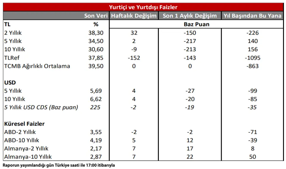 Yurtiçinde Türk finansal varlıklar bu hafta genelinde pozitif bir seyir izledi. 11 Aralık itibarıyla MSCI Türkiye endeksi haftalık bazda %2,7 yükseliş kaydetti. Ülke risk primi ve uzun vadeli TL cinsi tahvil faizlerinde düşüş görüldü. TL, dolar ve euro eşit ağırlıklı sepet kur karşısında haftayı değer kaybıyla kapatacak görüntüsü sergiliyor.