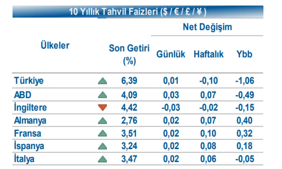 Dolar Endeksi 98,885 seviyesine yükselirken, Euro / Dolar paritesi 1,1662 seviyesine geriledi. Dolar / TL spot kuru ise 42,44 seviyesinden işlem gördü. Yurt içi piyasalarda, TL tahvilerde alış eğilimi devam etti. 2 yıllık gösterge tahvilin bileşik faizi 7 bp azalışla %37,77’ye gerilerken, 10 yıllık gösterge tahvilin faizi %30,80 seviyesinde değim kaydetmedi.