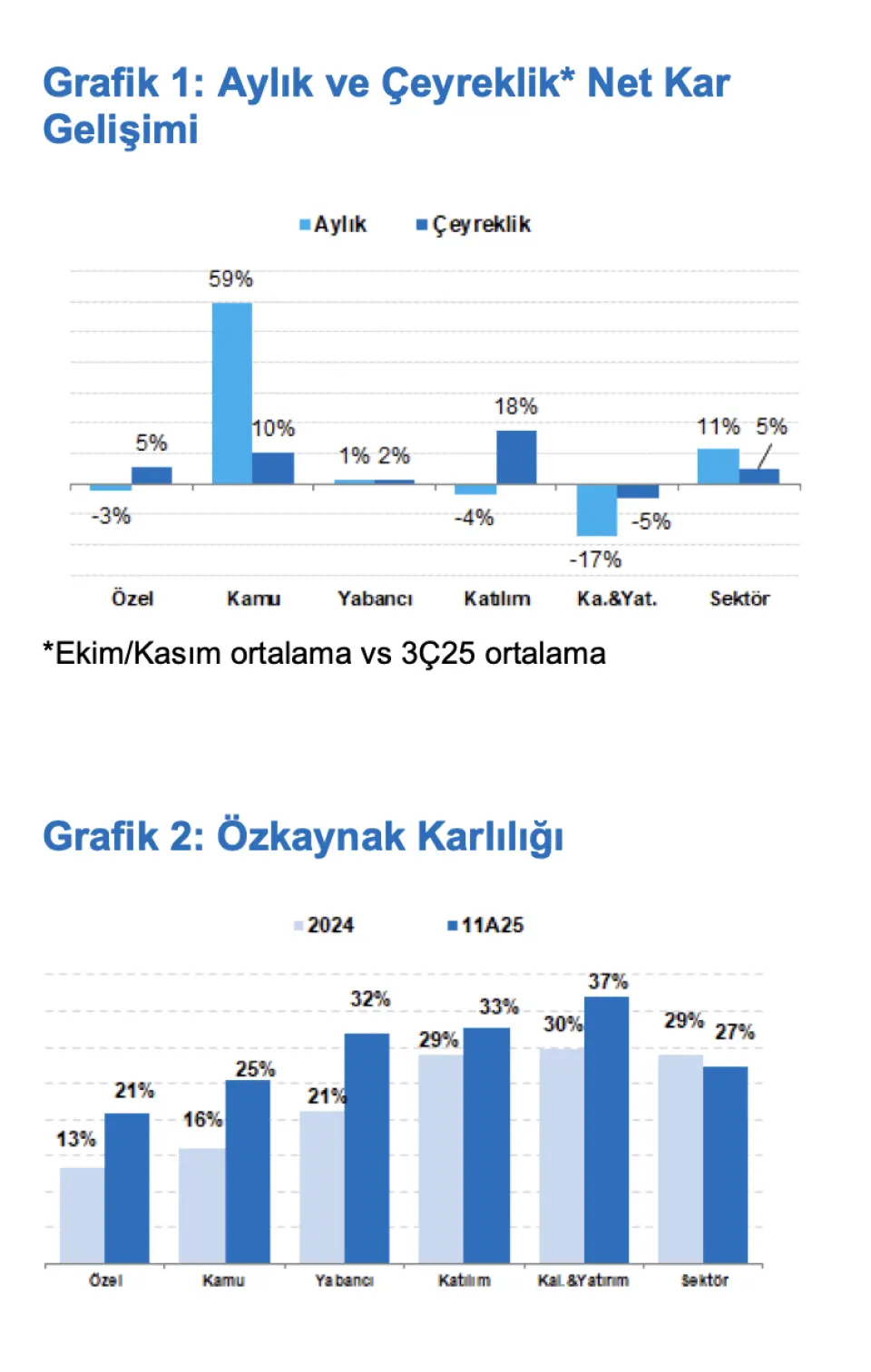 - "Bankacılık sektörünün Kasım net kârı 91 milyar TL olarak gerçekleşti. Bu rakam aylık olarak %11 artışa, yıllık olarak ise %35 artışa işaretetmektedir. Ekim/Kasım net kar ortalamasını 3Ç25 ortalaması ile karşılaştırdığımızda çeyreklik %5 artış gerçekleşti. Sektörün özkaynak karlılığı Kasım’da %29 seviyesindedir (11A25: %27)."