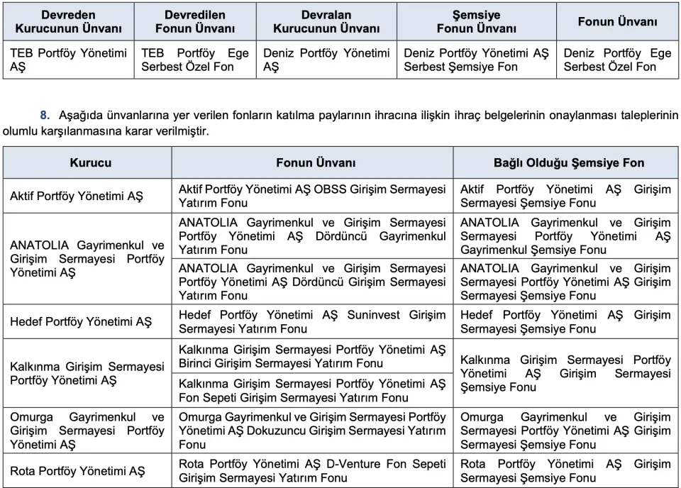 Bu kararla; TEB Portföy Yönetimi AŞ’ye ait “TEB Portföy Ege Serbest Özel Fon”unun, Deniz Portföy Yönetimi AŞ’ye devri onaylandı. Artık fon Deniz Portföy Yönetimi AŞ Serbest Şemsiye Fon olarak faaliyet gösterecek. Fonun yeni adı da “Deniz Portföy Ege Serbest Özel Fon” oldu.