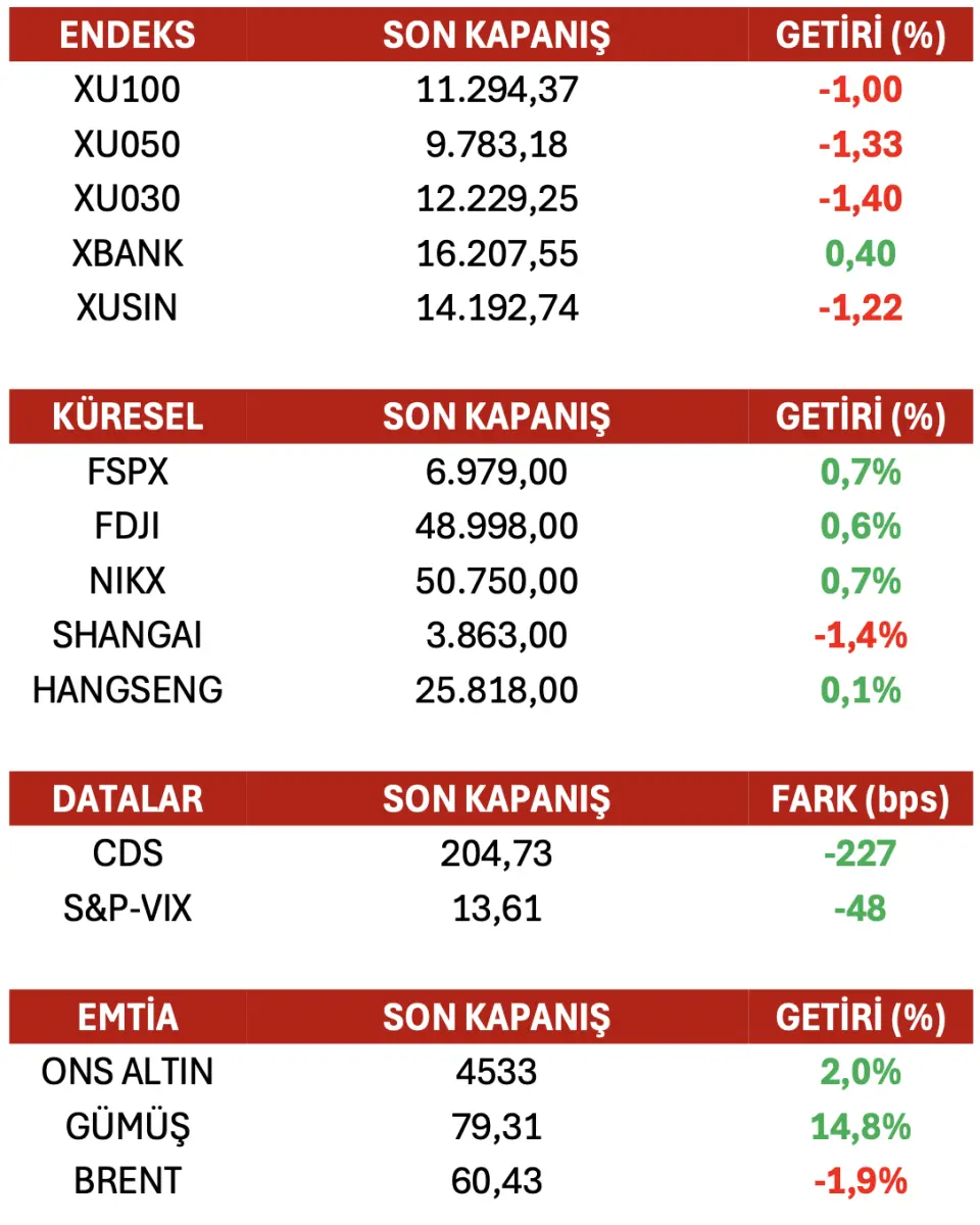 - "Küresel tarafta geçtiğimiz hafta Noel Bayramı tatilinin ardından yeni haftada da Yıl sonu etkisiyle görece sınırlı işlemler beklemekteyiz. Ekonomik veri seti anlamında da zayıf bir haftayı izlerken içeride olduğu gibi küresel tarafta da PMI verilerini takip edeceğiz. Haftanın geneli için ise Trump’ın ‘’Rusya-Ukrayna barışının son aşamasına geldik’’ demeciyle beraber bölgeden gelen haber akışlarının önemli olacağını vurgulamak isteriz."