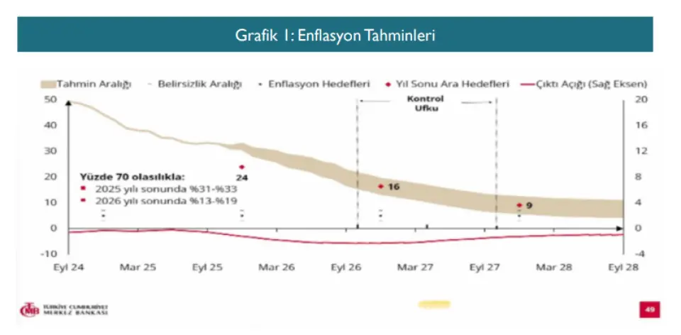 ▪ TCMB, enflasyon tahminlerinde değişiklik kararı aldı. Bu değişiklikle, Enflasyon Raporu tahminlerine ek olarak fiyat istikrarı sağlanana kadar ara hedeflerin ilan edilmeye devam edeceği belirtildi. Bu doğrultuda 2025 yıl sonu enflasyon tahmin aralığı %25–29’dan %31– 33’e yükseltildi; böylece tahminin orta noktası %27’den %32’ye çıkmış oldu. Ek olarak, 2026 ve 2027 yılları için ise enflasyon ara hedefleri sırasıyla %13-19 arasında (önceki: %11) ve %9 olarak sabit bırakıldı. Ayrıca çıktı açığının 2028 sonuna kadar negatif kalması öngörüldüğü ifade edildi.