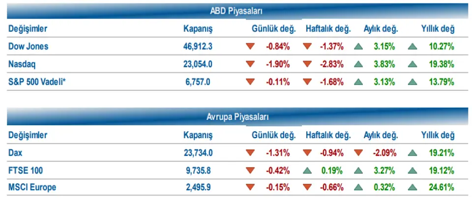 ABD endekslerinde satıcılı seyir izlendi. Dow Jones endeksi %0,84 kayıpla 46.912,30, S&P 500 endeksi %1,12 düşüşle 6.720,32 ve Nasdaq endeksi %1,90 kayıpla 23.053,99 puandan günü tamamladı. ABD’de tahvil faizleri cephesinde 2 yıllık tahvil faizi %3,56, 10 yıllık tahvil faizi ise %4,08 seviyesine geriledi. Öte yandan, VIX endeksi ise 18,01’den 19,50 seviyesine yükseldi.