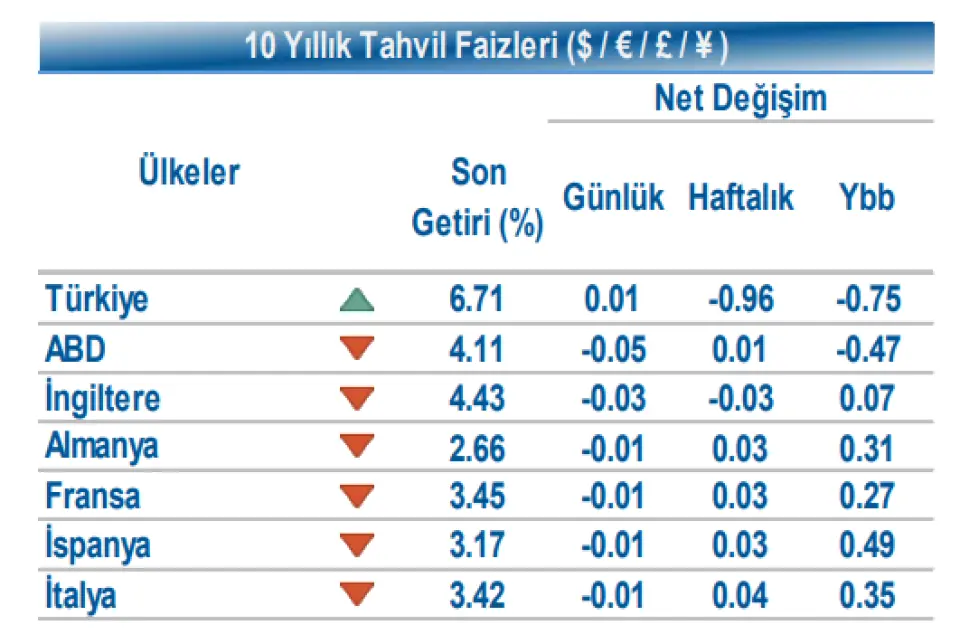 Halk Yatırım yayınladığı tarihli 7 Kasım günlük bültende tahvil ve döviz piyasalarındaki gelişmelere yer verdi. Aracı kurumun analizi şu şekilde:Küresel piyasalarda, Euro Bölgesinde Eylül ayı Perakende Satışlar verisi beklentilerin aksine %0,1 azalış gösterirken, İngiltere Merkez Bankası politika faizini %4 seviyesinde sabit bıraktı. Veriler sonrası tahvil piyasalarında sınırlı alıcılı seyir izlendi. Gün içinde ABD 10 yıllık gösterge tahvil faizi 5 bp azalışla %4,11, Almanya 10 yıllık gösterge tahvil faizi 1 bp azalışla %2,66, İngiltere 10 yıllık gösterge tahvil faizi 3 bp azalışla %4,43 seviyesinde işlem gördü. Türkiye’nin 5 yıllık Dolar cinsi CDS risk primi 242 bp seviyesinde işlem görürken, Ocak 2035 vadeli 10 yıllık Eurobond faizi 1 bp artışla %6,71 seviyesinden işlem gördü.