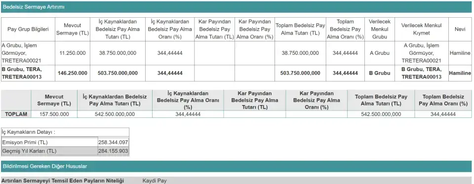 Yeni sermayeyi temsil eden 258.344.097 TL nominal hisse yani 258.344.097 milyon lot hisse hak sahibi yatırımcıların hesabına bedelsiz hisse olarak aktarılacak. Bu bedelsiz sermaye artırımı işleminde hesabında 100 lot TERA hissesi olanlar, herhangi ödeme yapmadan ve hiçbir başvuruda bulunmadan 444 lota sahip olacak.