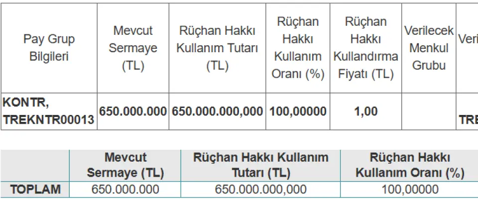 KONTR 650 mlyon Lira olan mevcut sermayesini %100 bedelli artırarak 1 milyar 300 milyon Liraya çıkartıyor. Sermaye artırımını Sermaye Piyasası Kurulu SPK onayladı.
