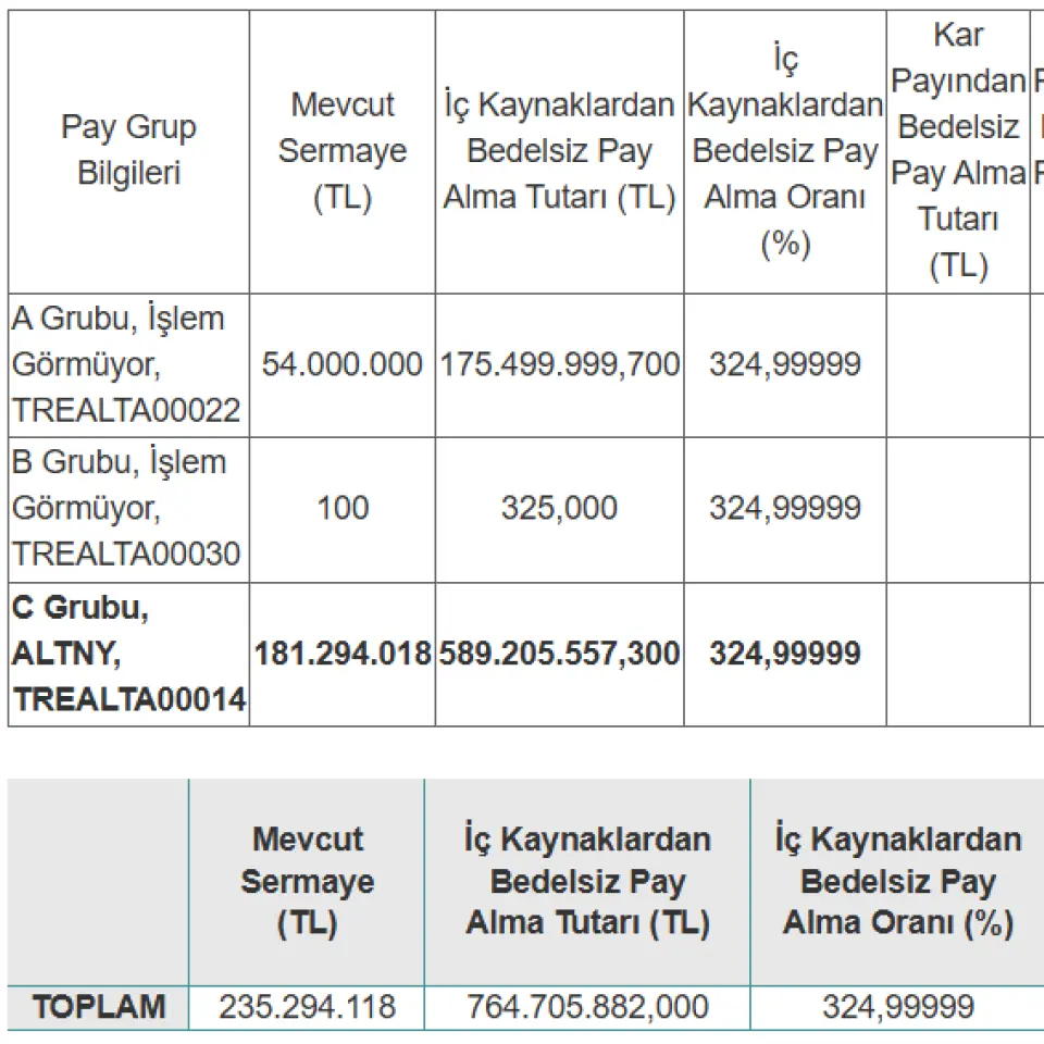 ALTNY mevcut 235.294.118 Lira olan sermayesini %325 oranında bedelsiz artırarak 1 milyar Liraya çıkartıyor.