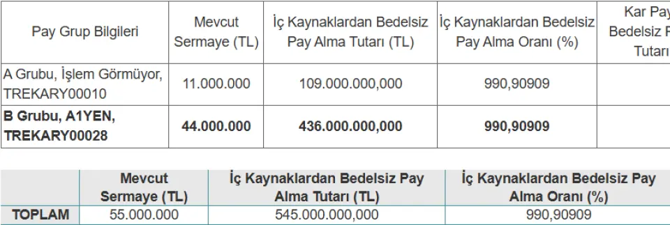 Yeni sermayeyi temsil eden 545 milyon Lira nominal hisse, yani 545 milyon lot hisse hak sahibi yatırımcılara bedelsiz hisse olarak dağıtılacak.