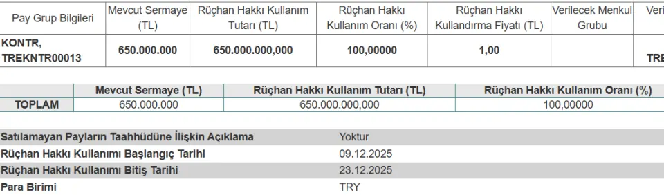 KONTR 650 mlyon Lira olan mevcut sermayesini %100 bedelli artırarak 1 milyar 300 milyon Liraya çıkartıyor. Sermaye artırımını Sermaye Piyasası Kurulu SPK onayı alan şirket bugün sermaye artırımına başlıyor. 2 hafat boyunca devam edecek olan rüçhan hakı kullanımı 23 Aralık günü sona erecek.