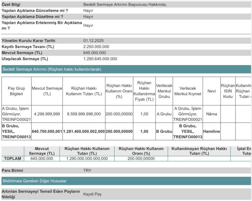 Buna göre; 2.250.000.000 TL kayıtlı sermaye tavanı içerisinde, her biri 1 TL nominal değerde 645.000.000 TL olan Yeşil Yatırım'ın çıkarılmış sermayesinin tamamı nakden karşılanmak sureti ile 1.290.000.000 TL bedelli olarak %200 oranında artırılarak 1.935.000.000 TL'ye yükseltilmesine, Mevcut ortakların yeni pay alma haklarının kullandırılmasına Nakden arttırılan 1.290.000.000 Türk Lirası sermayeyi temsil eden payların 8.599.999,99 Türk Liralık kısmı A grubu nama yazılı ve 1.281.400.000,01 Türk Liralık kısmı B Grubu hamiline yazılı olarak ihraç edilmesi kararlaştırıldı.
