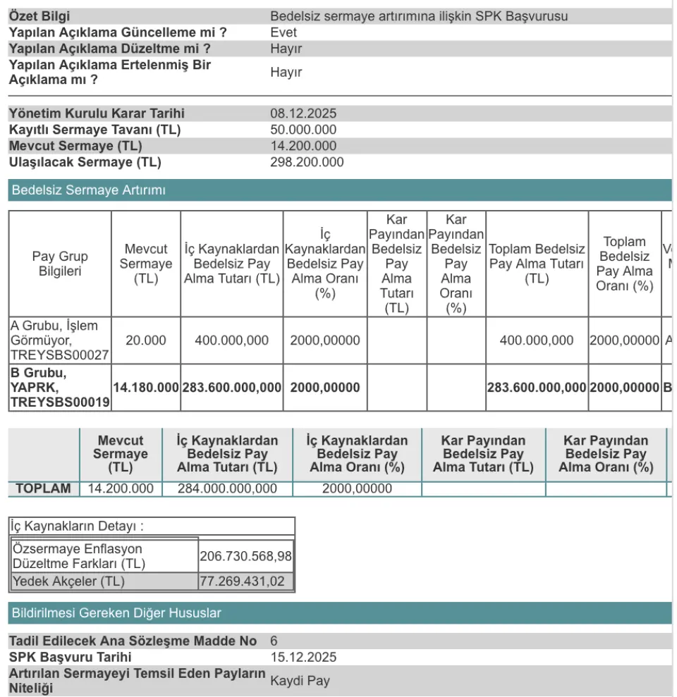 YAPRK Bedelsiz Sermaye Artırımına İlişkin KAP Bildirimi