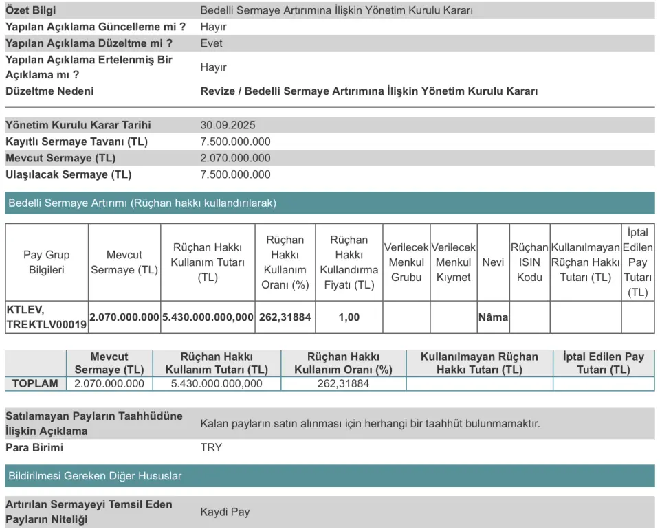 KTLEV Bedelli Sermaye Artırım Kararı ise Şu Şekildeydi: