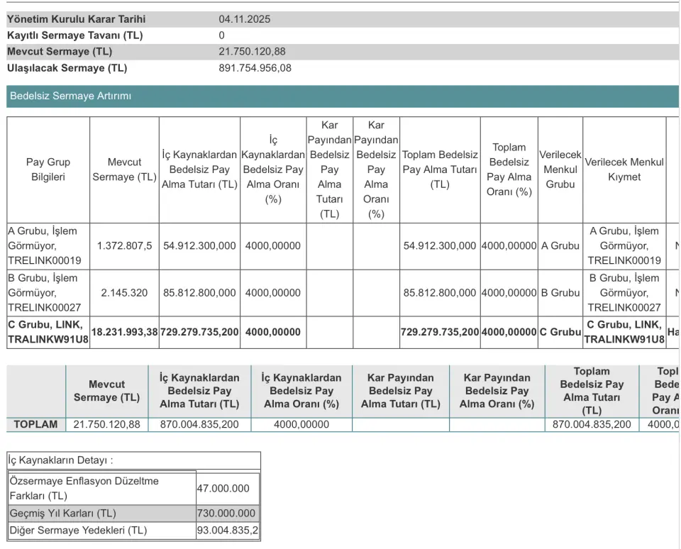 Geçtiğimiz günlerde Link Bilgisayar, yönetim kurulu kararını revize edip ve evraklarını yeniden SPK’ya göndermişti. LINK, mevcutta 21.750.120 TL olan sermayesini %4000 oranında bedelsiz olarak artırarak 891.754.956 TL’ye yükseltecek. Artışın iç kaynaklardan karşılanacağı ve tamamının bedelsiz olarak yatırımcılara dağıtılacağı belirtildi.