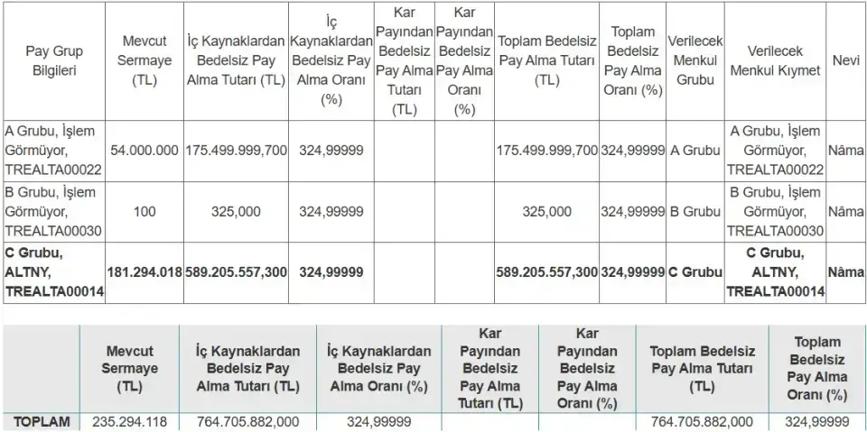 Yeni sermayeyi temsil eden 764.705.882 TL nominal hisseye denk gelen 764.705.882 lot hisse hak sahibi yatırımcılara bedelsiz olarak verilecek. Bedelsiz sermaye artırımında hesabınızda 500 lot ALTNY hissesi olanlar 2.125 lotun sahibi olacak. Ayrıca, bunun için herhangi bir başvuru ya da işlem gerçekleştirmeyecekler.