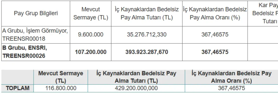 ENSRI mevcut 116.800.000 TL olan sermayesini %367,46575 oranında bedelsiz artırarak 546 milyon Liraya çıkartıyor.