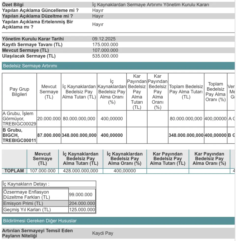 BIGCH Bedelsiz Sermaye Artırımına İlişkin Resmi KAP Açıklaması
