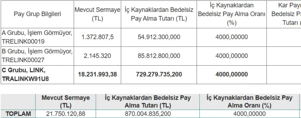 LINK mevcut 21.750.120 TL olan sermayesini %4000 oranında bedelsiz artırarak 891.754.956 TL ye çıkartıyor.