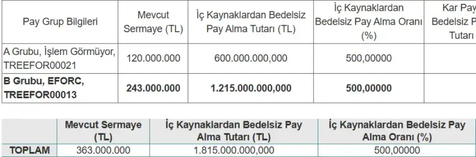 Yeni sermayeyi temsil eden 1.815.000.000 TL nominal hisse, yani 1.815.000.000 lot hisse hak sahibi yatırımcılara bedelsiz şeklinde verilecek. Bu bedelsiz sermaye artırımında hesabında 500 lot EFORC hissesi olanlar 3000 lotun sahibi olacak. Üstelik bunun için herhangi bir ek ücret edemesi ya da başvuru yapmayacaklar.