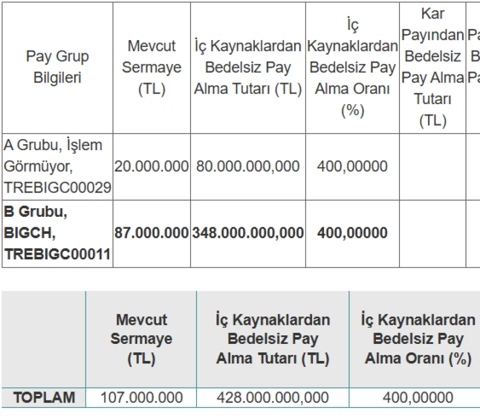 Şu anda hesabınızda BIGCH hissesi olmasa bile, şirket tarafından açıklanacak olan bu tarihe kadar hisseyi borsadan satın alan bütün yatırımcılar, bu bedelsiz sermaye artırımından yararlanabilir.