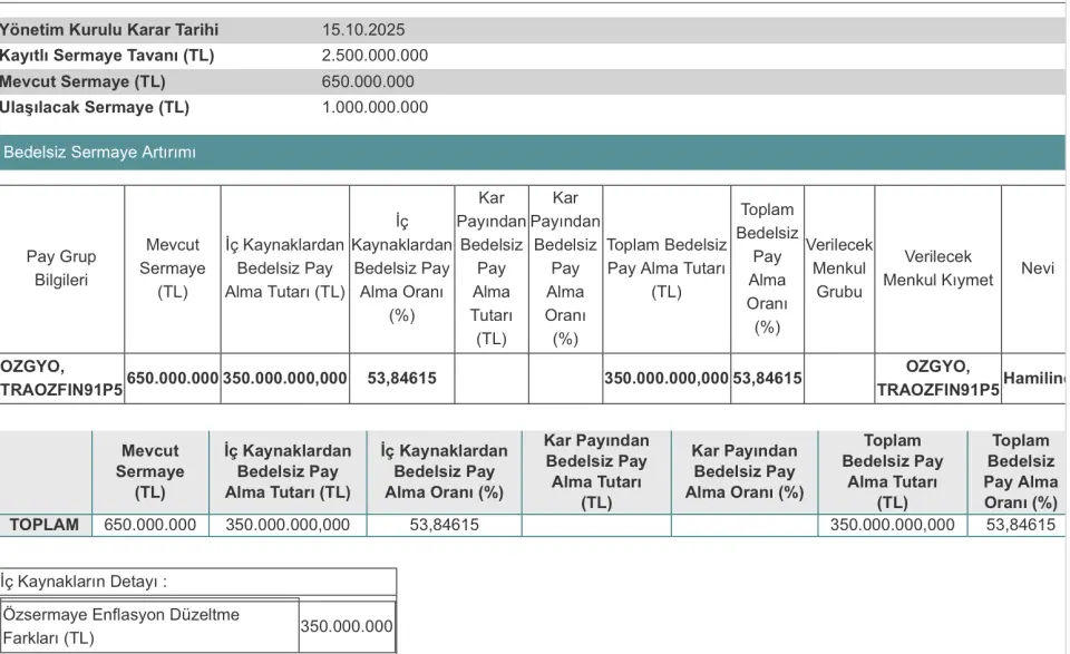 Özderici GYO'nun resmi KAP açıklamasında "Şirketimiz çıkarılmış sermayesinin tamamı iç kaynaklardan karşılanmak suretiyle 650.000.000 TL'den, 1.000.000.000 TL'ye artırılması nedeniyle, ihraç edilecek 350.000.000 TL itibari değerdeki paylara ilişkin İhraç Belgesinin onaylanması ve Esas Sözleşmenin Sermaye ve Paylar başlıklı 8. Maddesinin tadil edilmesine ilişkin uygun görüş alınması amacıyla 16.10.2025 tarihinde Sermaye Piyasası Kurulu'na gerekli izin başvurusu yapılmıştır. Tasarruf sahipleri ve kamuoyunun bilgisine sunulur." denildi.