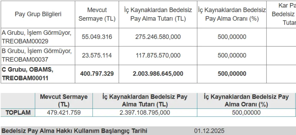 OBAMS mevcut 479.421.759 TL olan sermayesini %500 oranında bedelsiz artırarak 2.876.530.554 TL ye çıkartıyor.