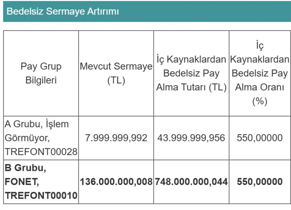 FONET, SPK'ya %550 oranında bedelsiz sermaye artırımı için başvuruda bulunmuştu. Şirket 2,5 Milyar TL'lik kayıtlı sermaye tavanı içerisinde bedelsiz sermaye artırımı gerçekleştirecek.Şirketin mevcut sermayesi şu anda 144 milyon TL olrak görünmekte. Gündemde olan %550'lik bedelsiz sermaye artırımının ardından şirketin yeni sermayesi 936 milyon TL olacak.