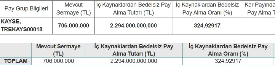 KAYSE mevcut 706 milyon Lira olan sermayesini %324,92917 oranında bedelsiz artırarak 3 milyar Liraya çıkartıyor.
