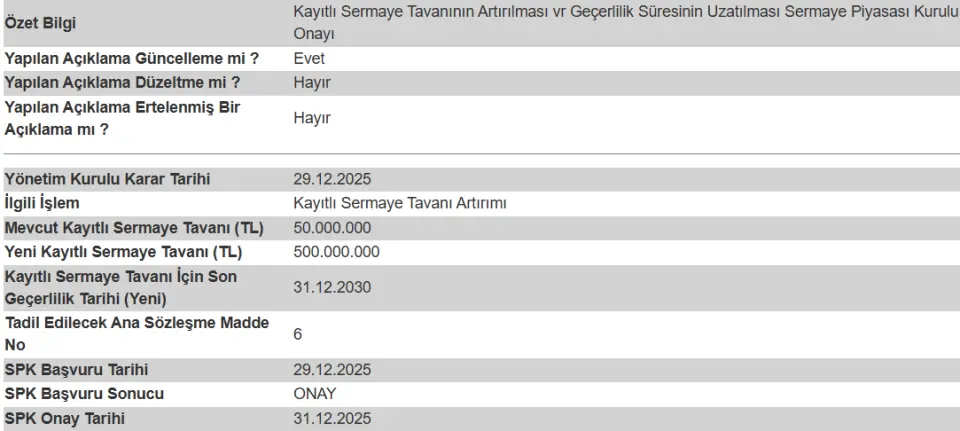 Kayıtlı sermaye tavanının artırılması ve geçerlilik süresinin uzatılmasına ilişkin SPK başvurumuz olumlu somuçlanmıştır.