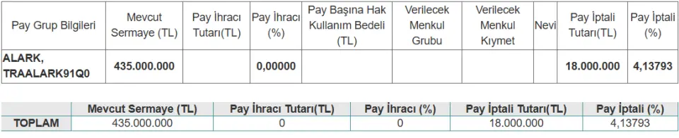 Bu durumda ALARK ın 435.000.000 TL olan sermayesi 18 milyon lot nominal hisse itfa edilince 417.000.000 TL ye düşürülüyor. Yani sermaye %4,13793 oraında azaltılıyor.