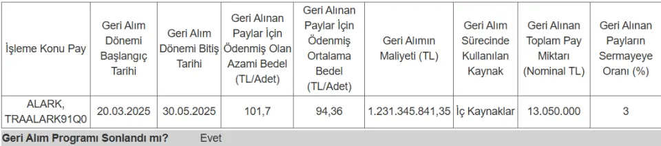 Şirket pay geri alım programını 30 Mayıs günü tamamladı. Bu sırada ALARK hissesi 104 TL ye kadar prim yapmıştı bile. Şirket planlandığı gibi tam 13.050.000 lot hissesini borsadan geri aldı ve bu alış için 1.231.345.841,35 TL harcandı. Holdingin daha önceden de elinde bulunan hisseler ile birlikte, geri alınna pay adedi 23.000.000 lota ulaştığı açıklandı. Bu adet payların sermayeye oranı % 5,287 oldu.