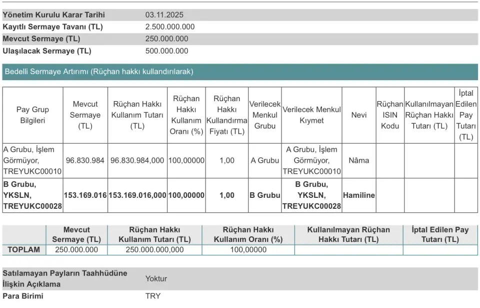 Yükselen Çelik, 2.500.000.000 TL kayıtlı sermaye tavanı içinde 250.000.000 TL olan çıkarılmış sermayesinin %100 bedelli sermaye artırımıyla 250.000.000 TL nakit karşılığı ile 500.000.000 TL’ye yükseltileceğini ifade etti. Şirket, sermaye artırımı işlemleri çerçevesinde Tera Yatırım Menkul Değerler A.Ş.’nin aracı kurum olarak seçildiğini aktardı.