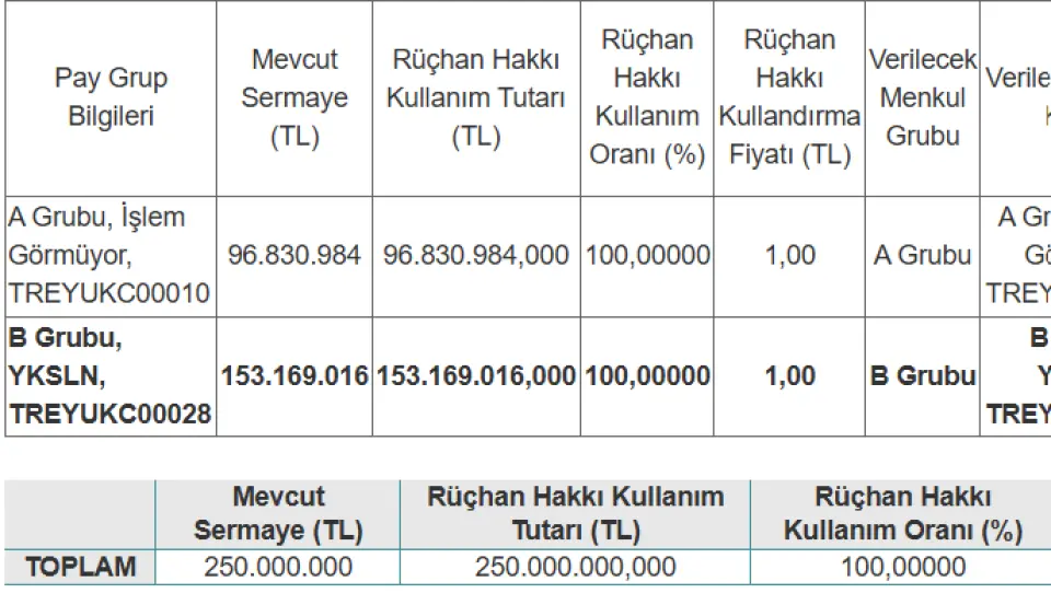 YKSLN mevcut 250 milyon TL olan sermayesini %100 bedelli artırarak 500 milyon TL ye çıkartacak. Şirket bedelli sermaye artırımında rüçhan hakkını 1 TL nominal fiyattan kullandıracak.
