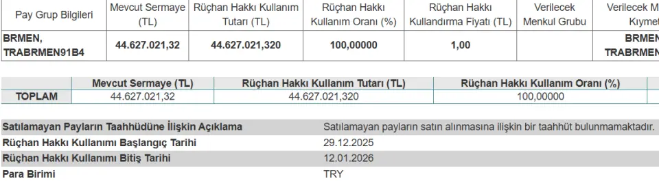 BRMEN %100 bedelli sermaye artırımı için tarih açıkladı. Şirket mevcut 44.627.021 TL olan sermayesini %100 bedelli artırarak 89.254.042 TL ye çıkartacak. Bedelli sermaye artırımı 29 Aralık pazartesi günü başlayacak. 15 gün devam edecek olan bedelli sermaye artırımında rüçhan hakkı 1 TL noinal fiyattan kullandırılacak.