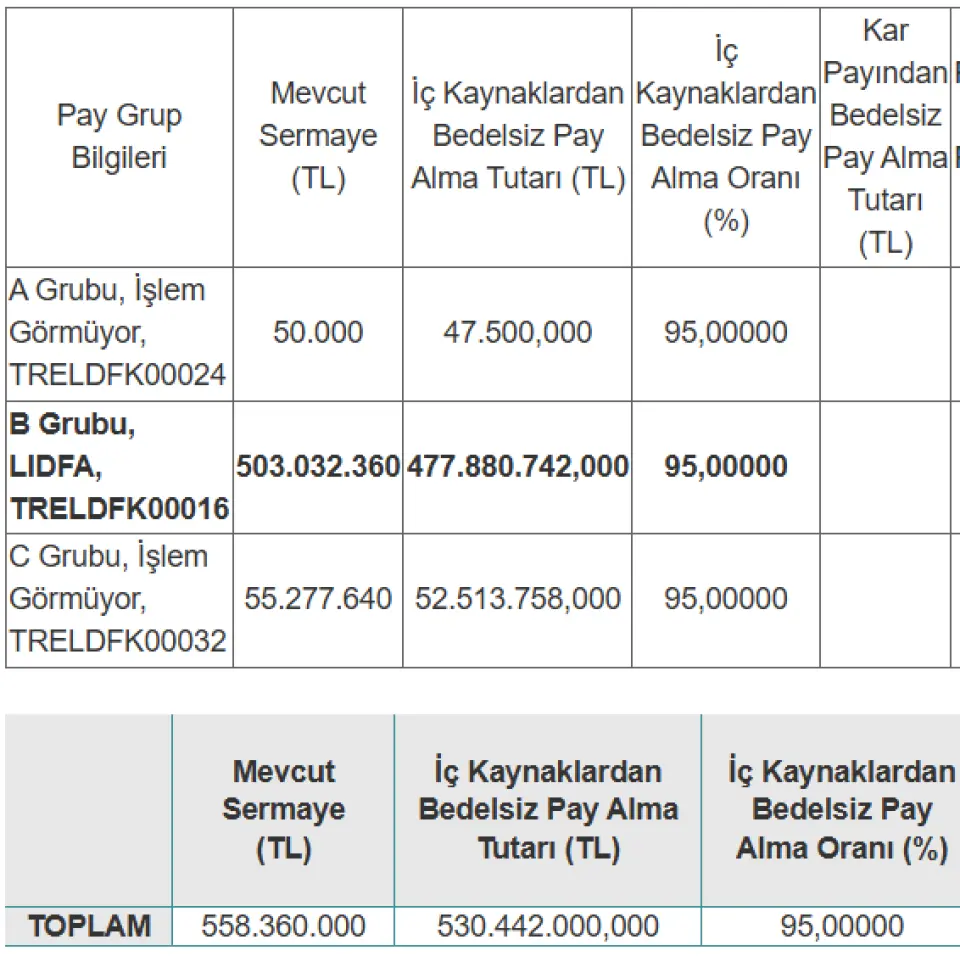 LIDFA mevcut 558.360.000 TL olan sermayesini %95 oranında bedelsiz artırarak 1.088.802.000 TL ye çıkartıyor.