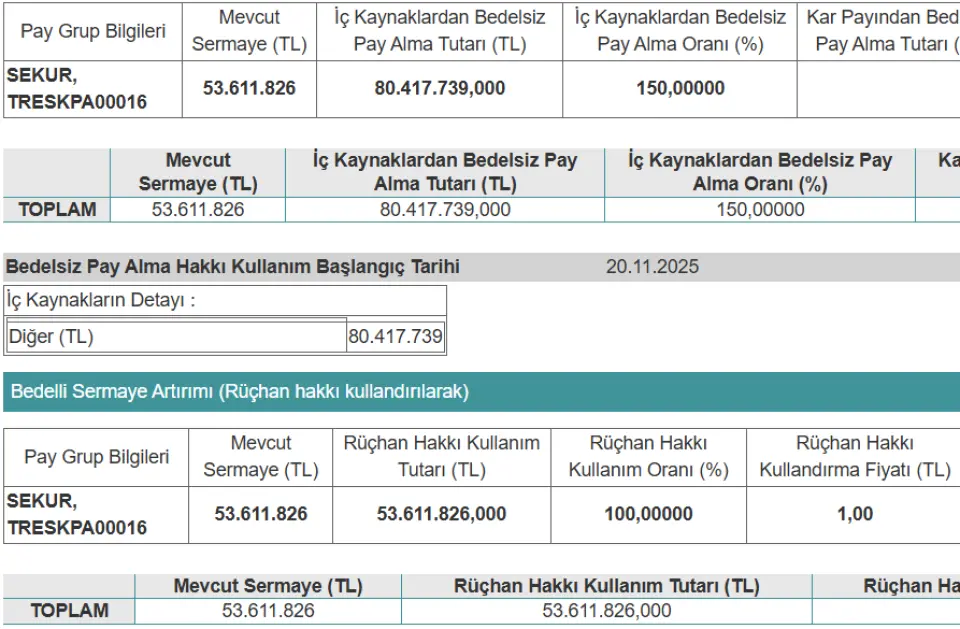 SEKUR yarın yani 20 Kasım günü bedelsiz ve bedelli sermaye artırımını gerçekleştiriyor.